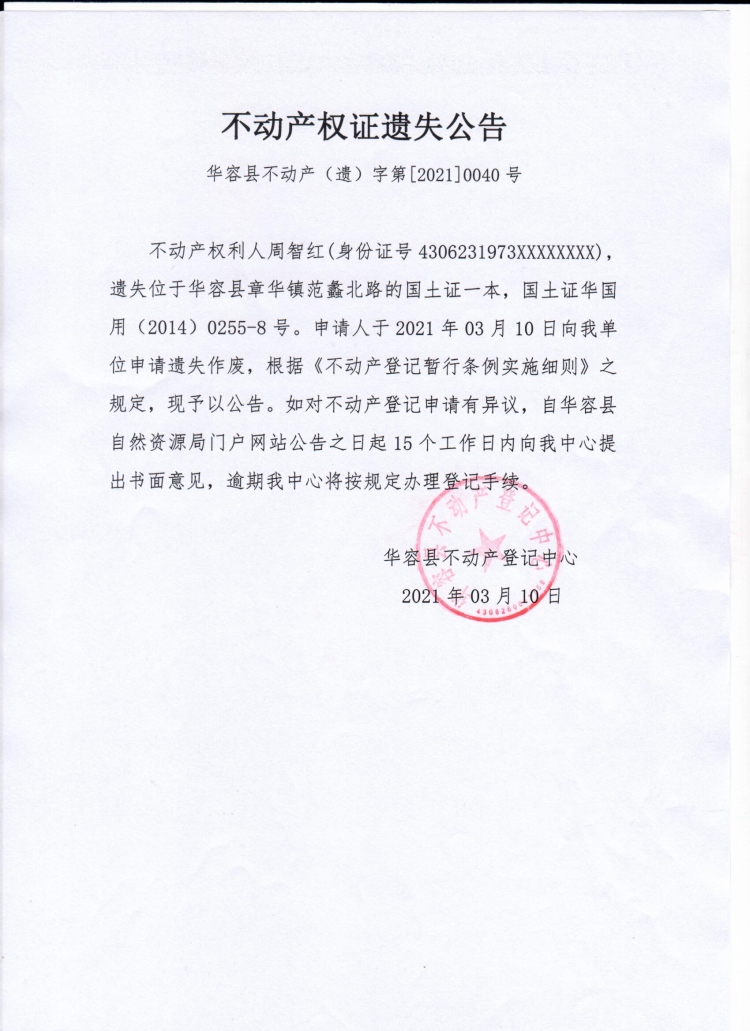 不动产权证遗失公告【国土证(周智红)】