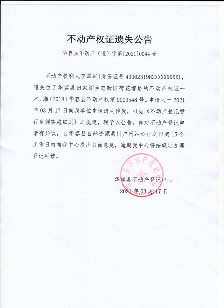 不动产权证遗失公告【不动产权证(李翠军)】