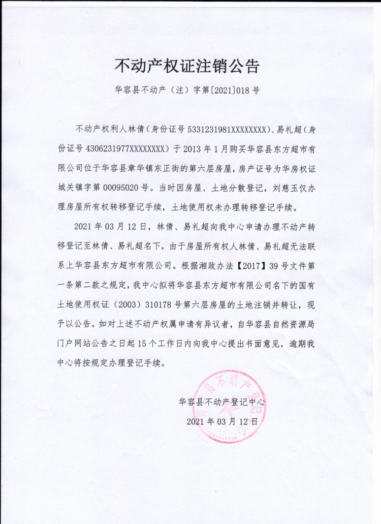 不动产权证书注销公告【(华容县东方超市有限公司转林倩、易礼超)】