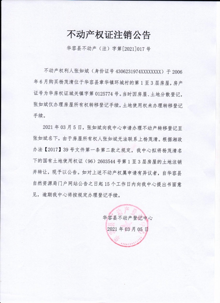 不动产权证书注销公告【(杨茂清转张如斌)】