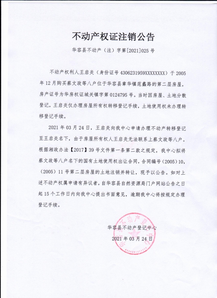 不动产权证书注销公告【(蔡文政等八户转王启炎)】