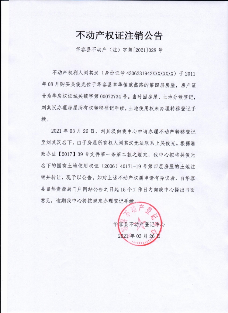 不动产权证书注销公告【(吴俊光转刘其汉)】