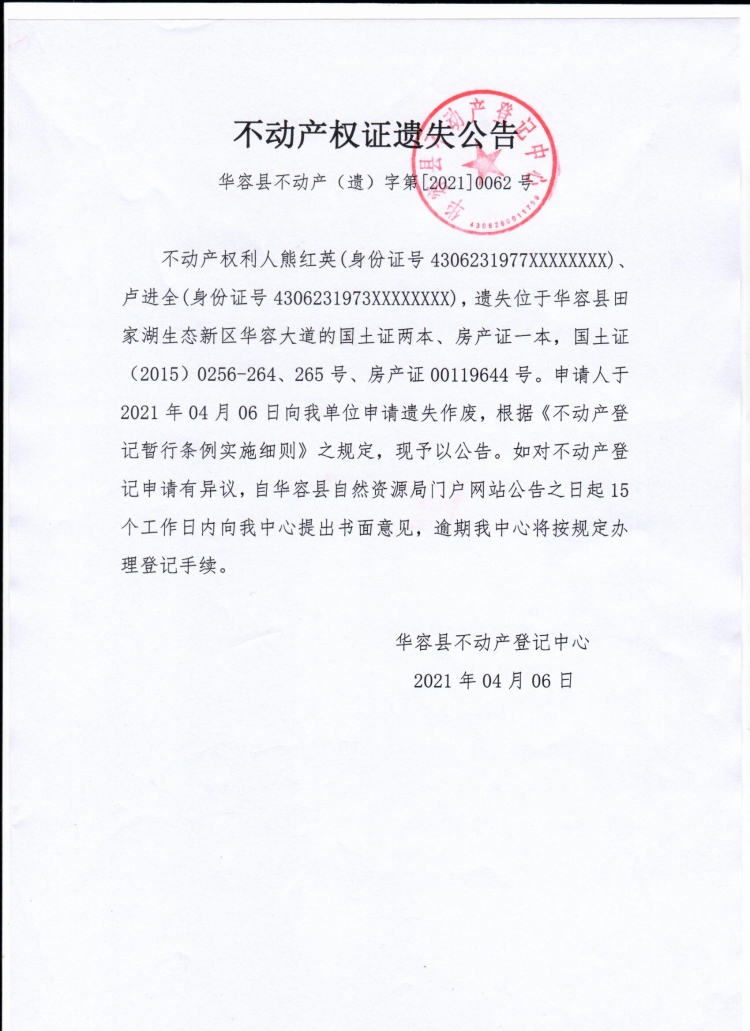 不动产权证遗失公告【国土证 房产证(熊红英)】