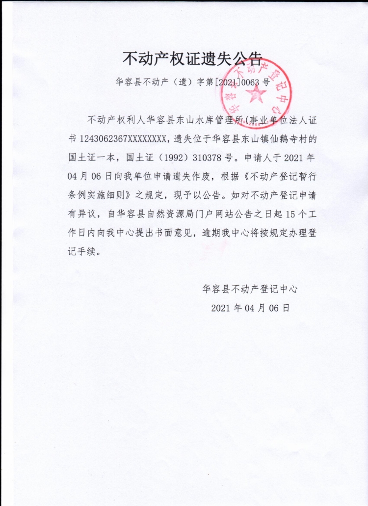 不动产权证遗失公告【国土证(华容县东山水库管理所)】