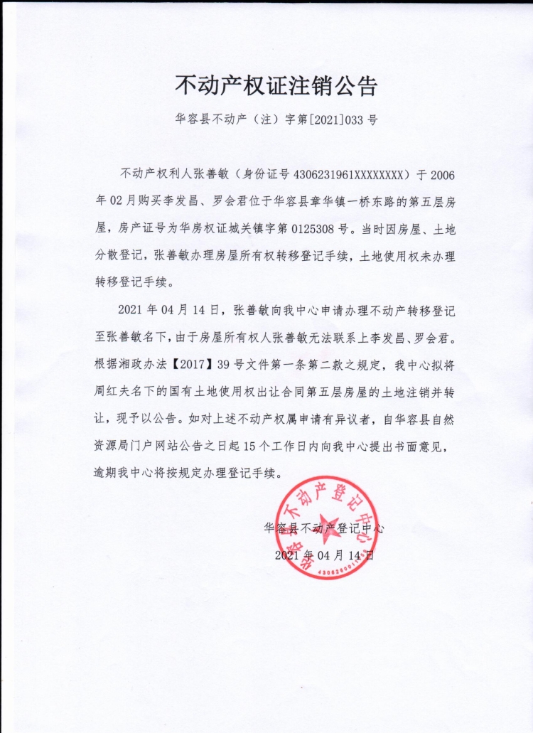 不动产权证书注销公告【(李发昌、罗会君转张善敏)】