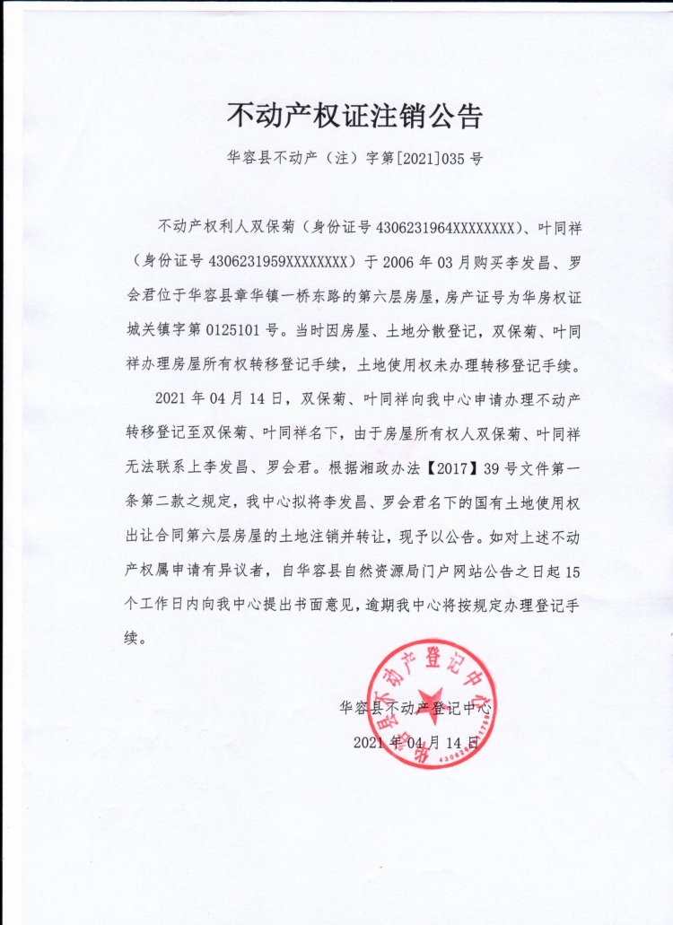 不动产权证书注销公告【(李发昌、罗会君转双保菊、叶同祥)】