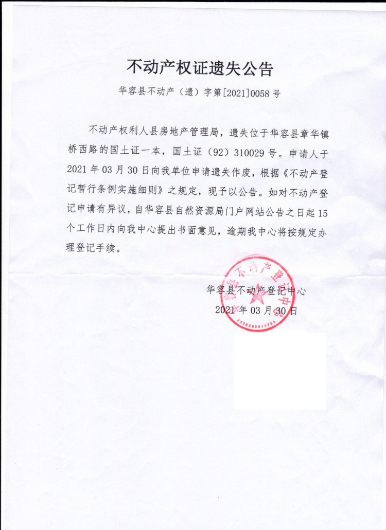 不动产权证遗失公告【国土证(县房地产管理局)】