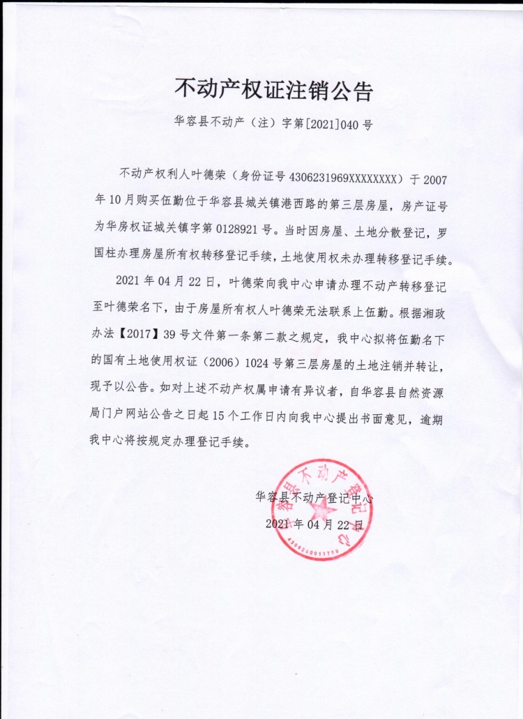 不动产权证书注销公告【(伍勤转叶德荣)】
