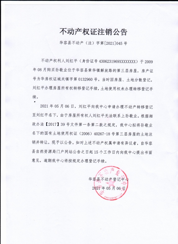 不动产权证书注销公告【(孙敬业转刘红平)】