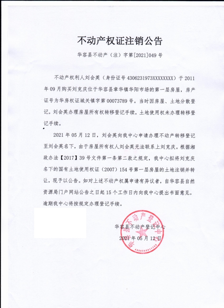 不动产权证书注销公告【(刘克庆转刘会英)】