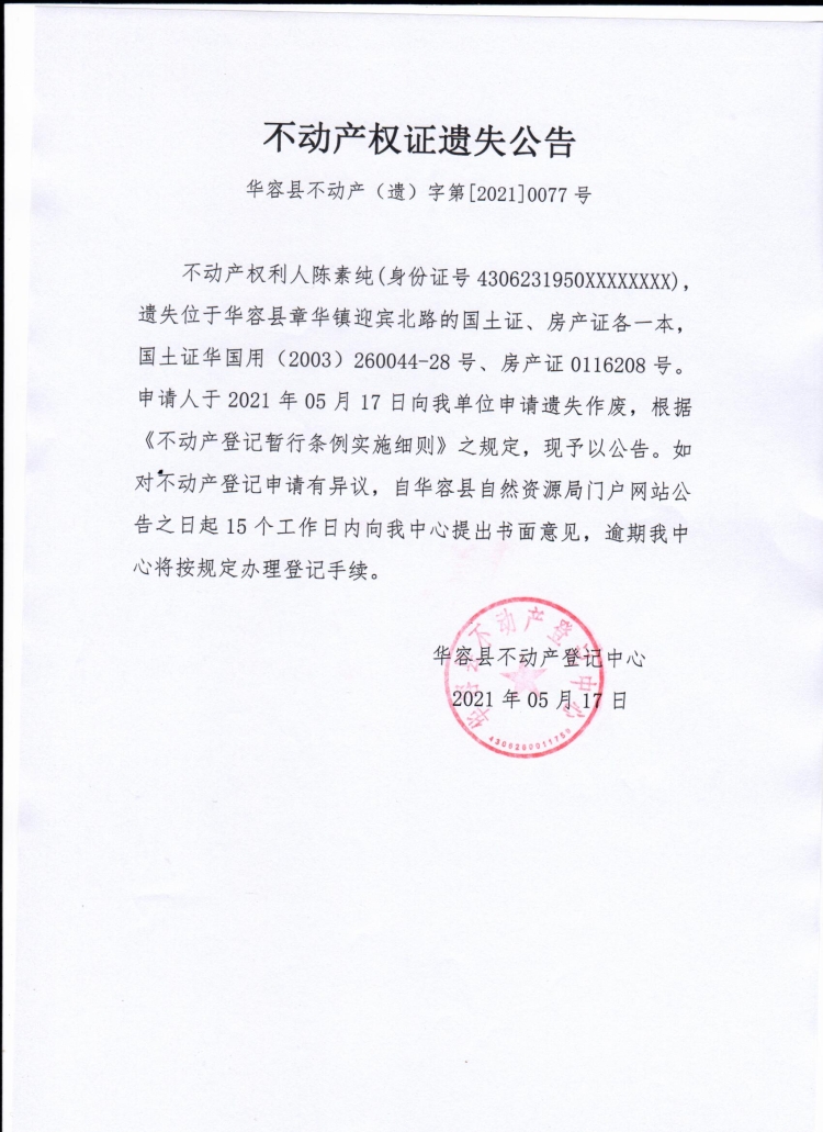 不动产权证遗失公告【国土证 房产证(陈素纯)】