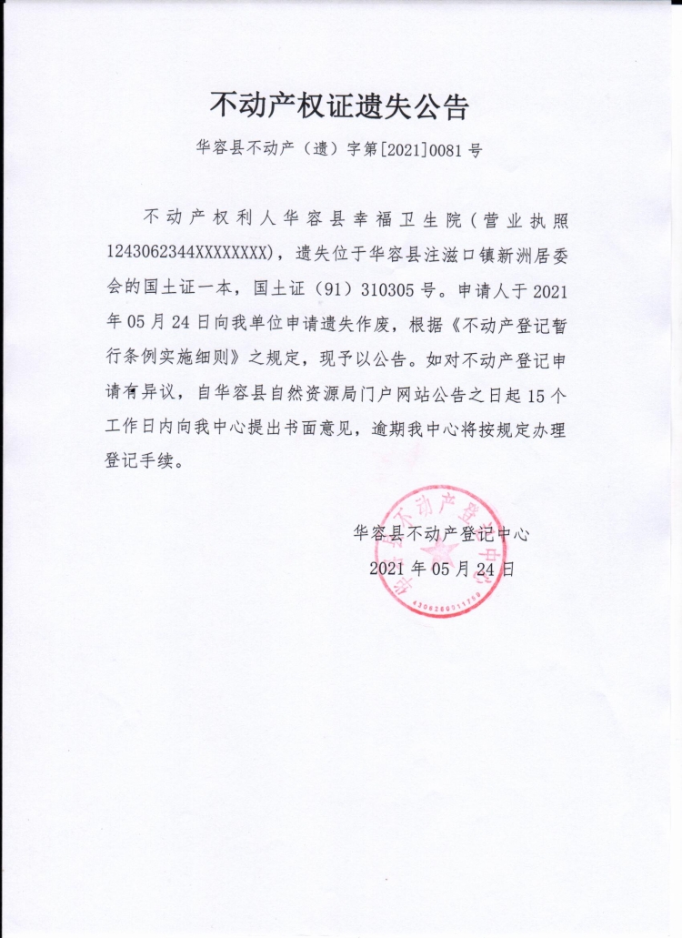 不动产权证遗失公告【国土证(华容县幸福卫生院)】
