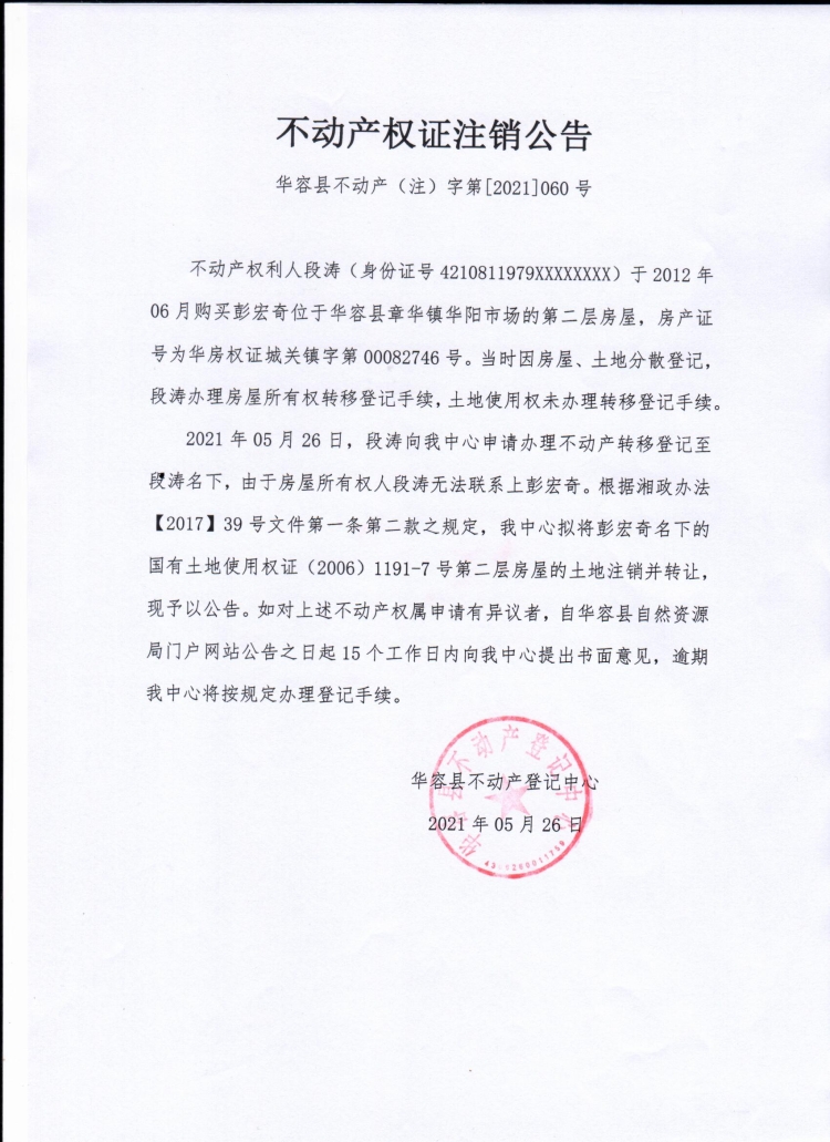 不动产权证书注销公告【(彭宏奇转段涛)】