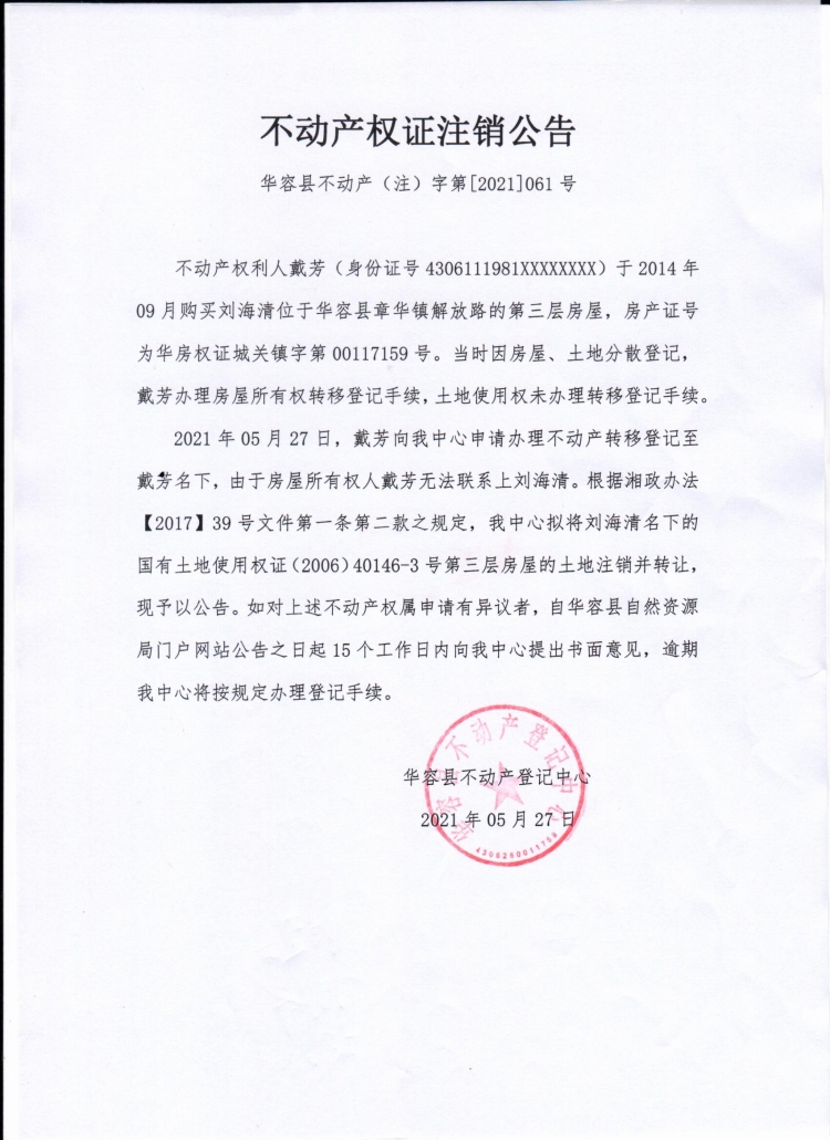 不动产权证书注销公告【(刘海清转戴芳)】