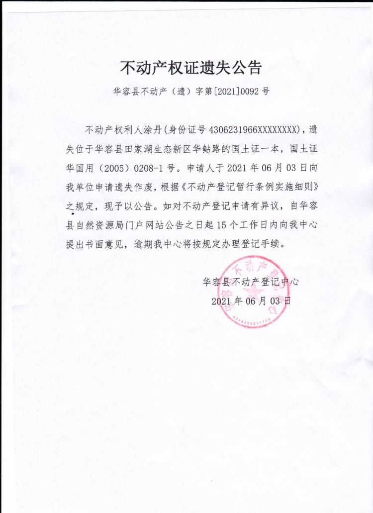 不动产权证遗失公告【国土证(涂丹)】