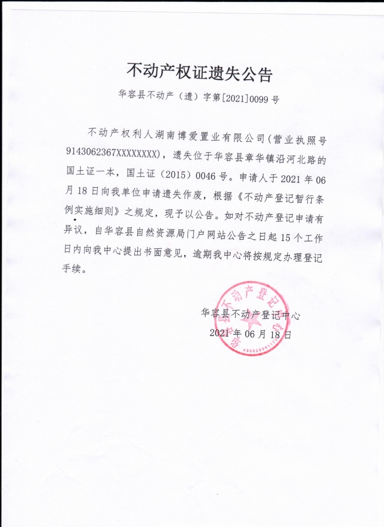 不动产权证遗失公告【国土证(湖南博爱置业有限公司)】