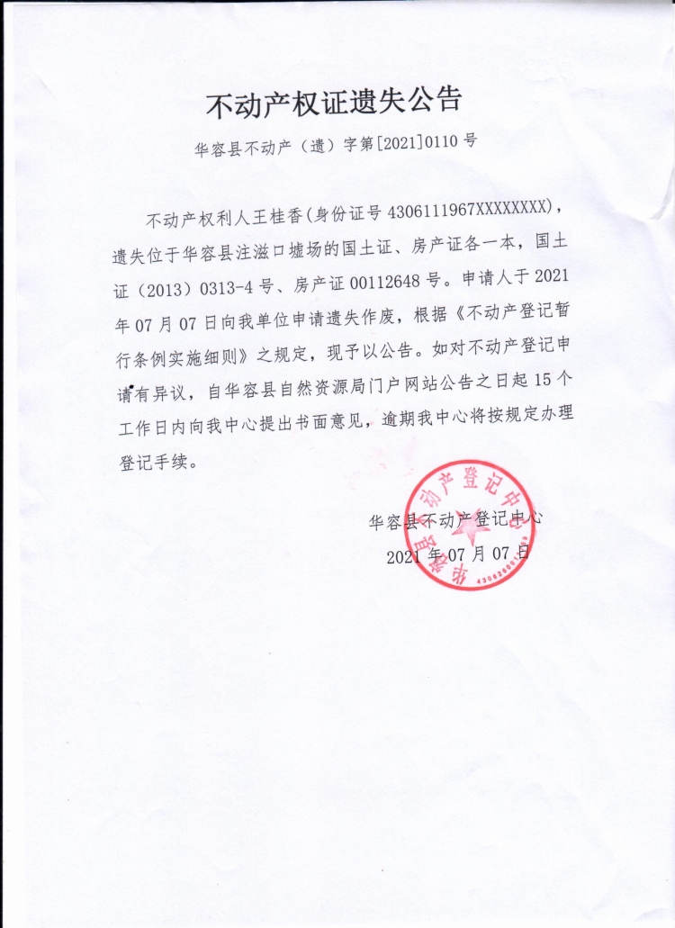 不动产权证遗失公告【国土证 房产证(王桂香)】