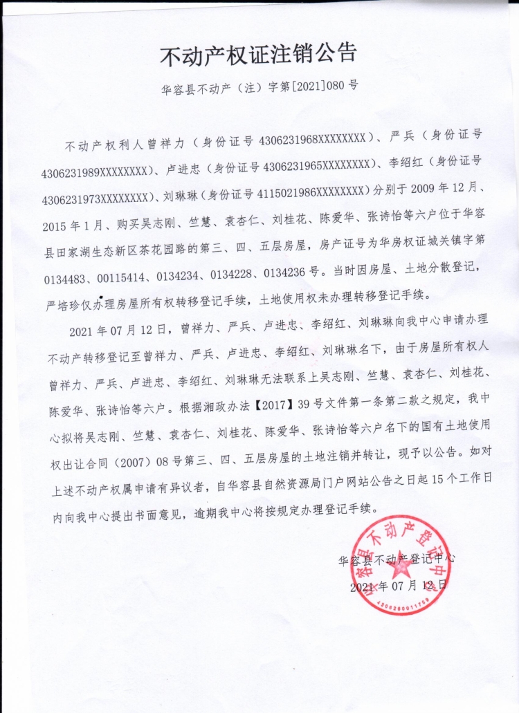 不动产权证书注销公告【(吴志刚等六户转曾祥力等五户)】