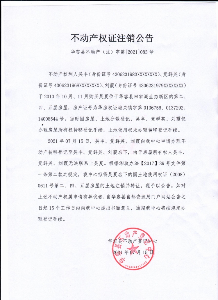 不动产权证书注销公告【(吴夏转吴丰、党群英、刘霞)】