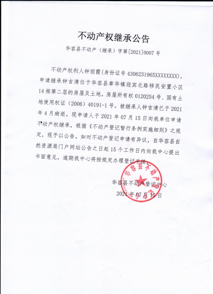 不动产权继承公告【(钟吉清转钟丽霞)】