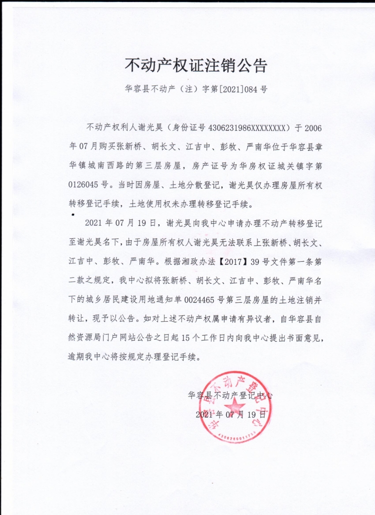 不动产权证书注销公告【(张新桥、胡长文、江吉中、彭牧、严南华转谢光昊)】