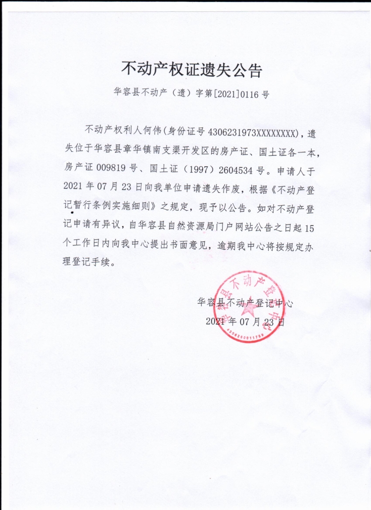不动产权证遗失公告【国土证 房产证(何伟)】