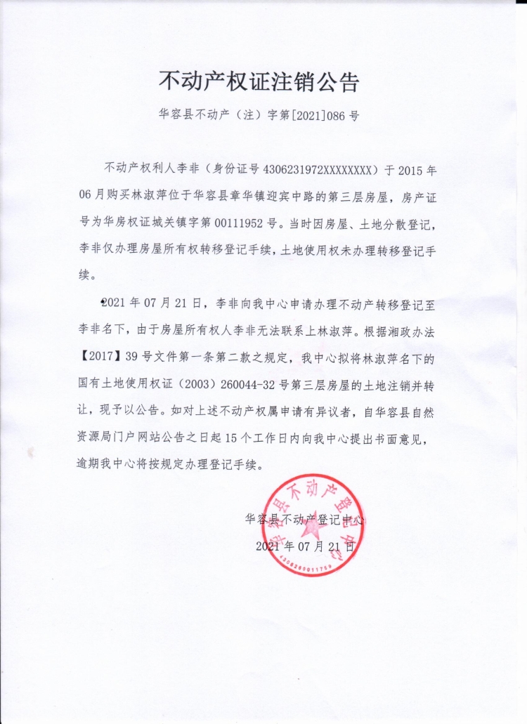 不动产权证书注销公告【(林淑萍转李非)】