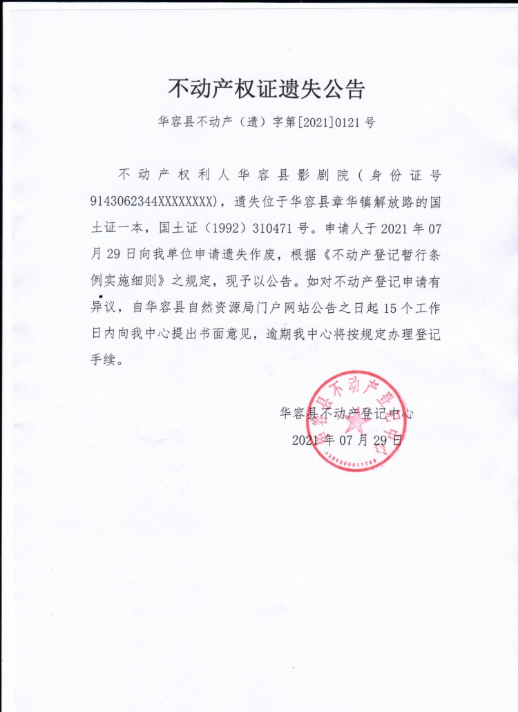 不动产权证遗失公告【国土证(华容县影剧院)】