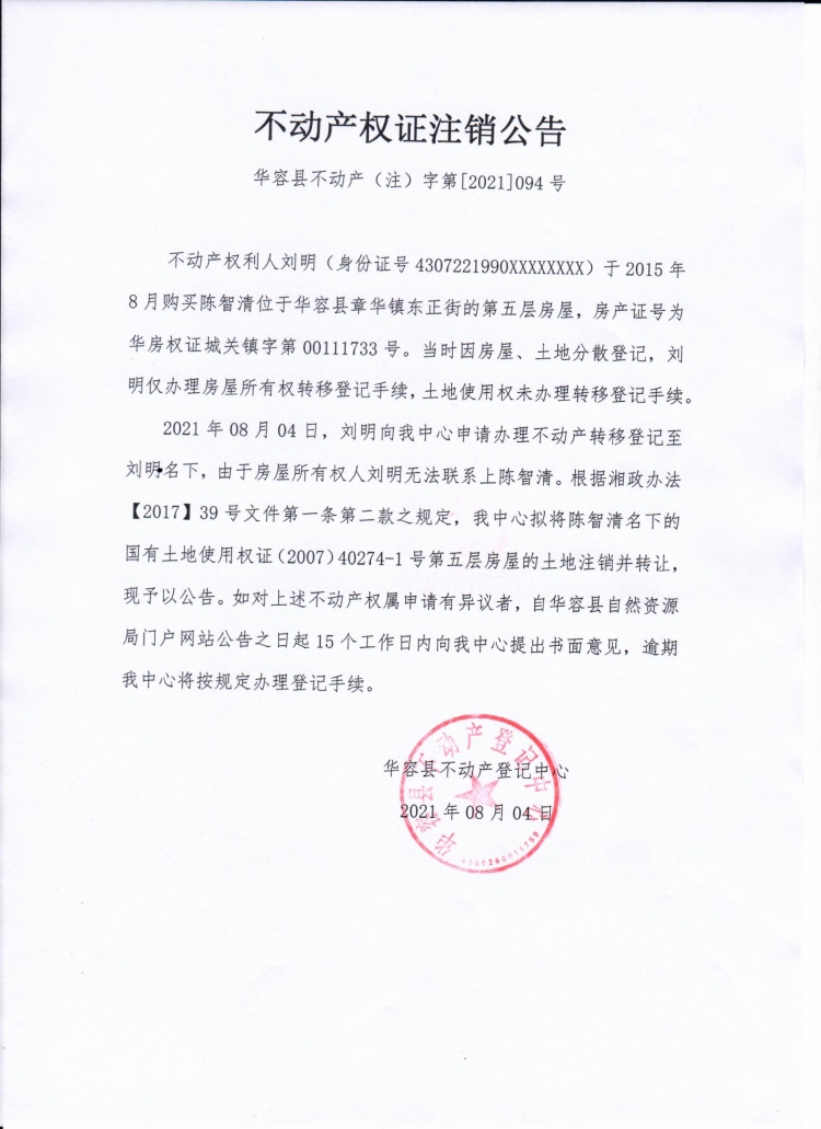 不动产权证书注销公告【(陈智清转刘明)】