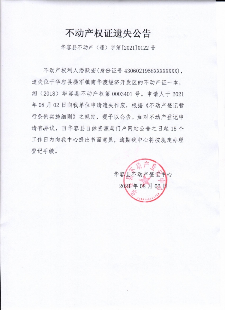 不动产权证遗失公告【不动产权证(潘跃宏)】