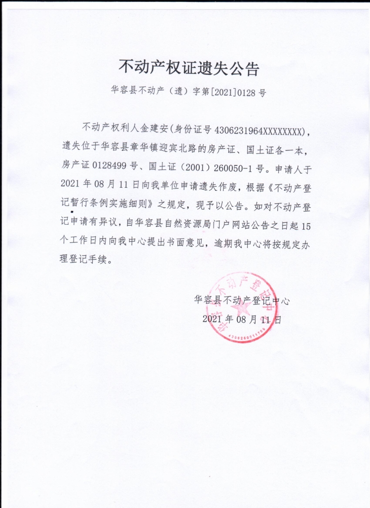 不动产权证遗失公告【国土证 房产证(金建安)】