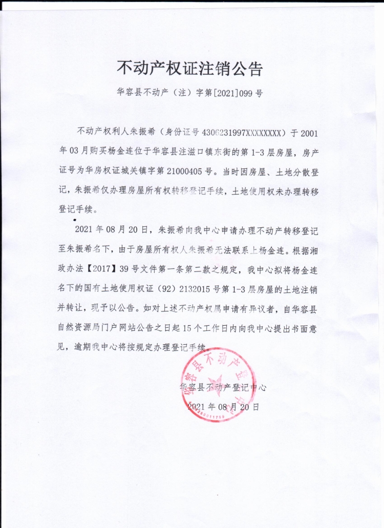 不动产权证书注销公告【(杨金连转朱振希)】