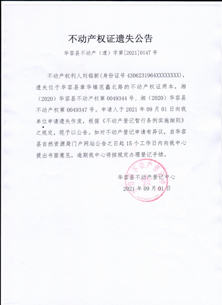 不动产权证遗失公告【不动产权证(刘铭新)】