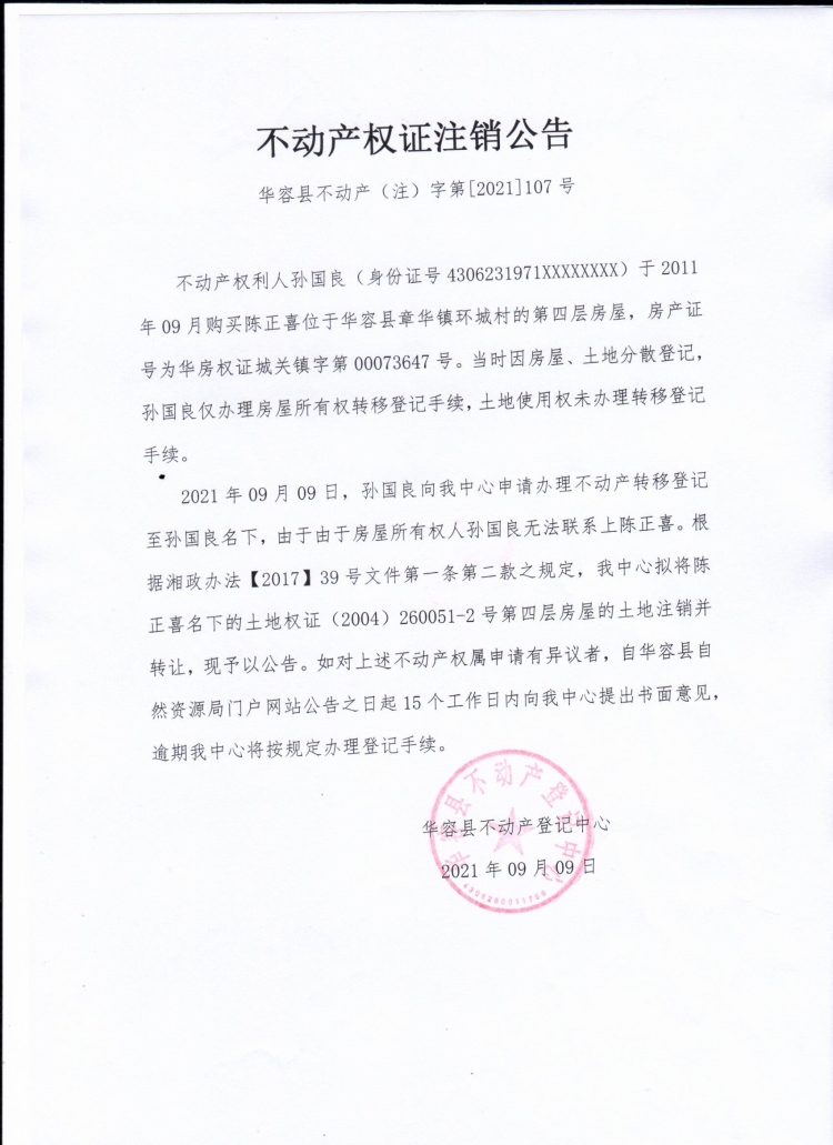 不动产权证书注销公告【(陈正喜转孙国良)】