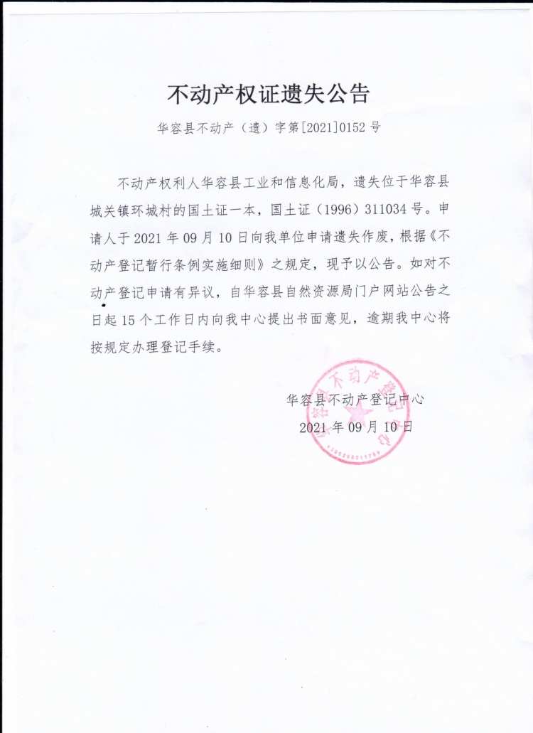 不动产权证遗失公告【国土证 (华容县工业和信息化局)】