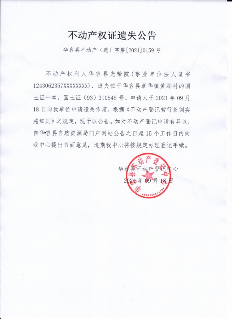 不动产权证遗失公告【国土证 (华容县光荣院)】