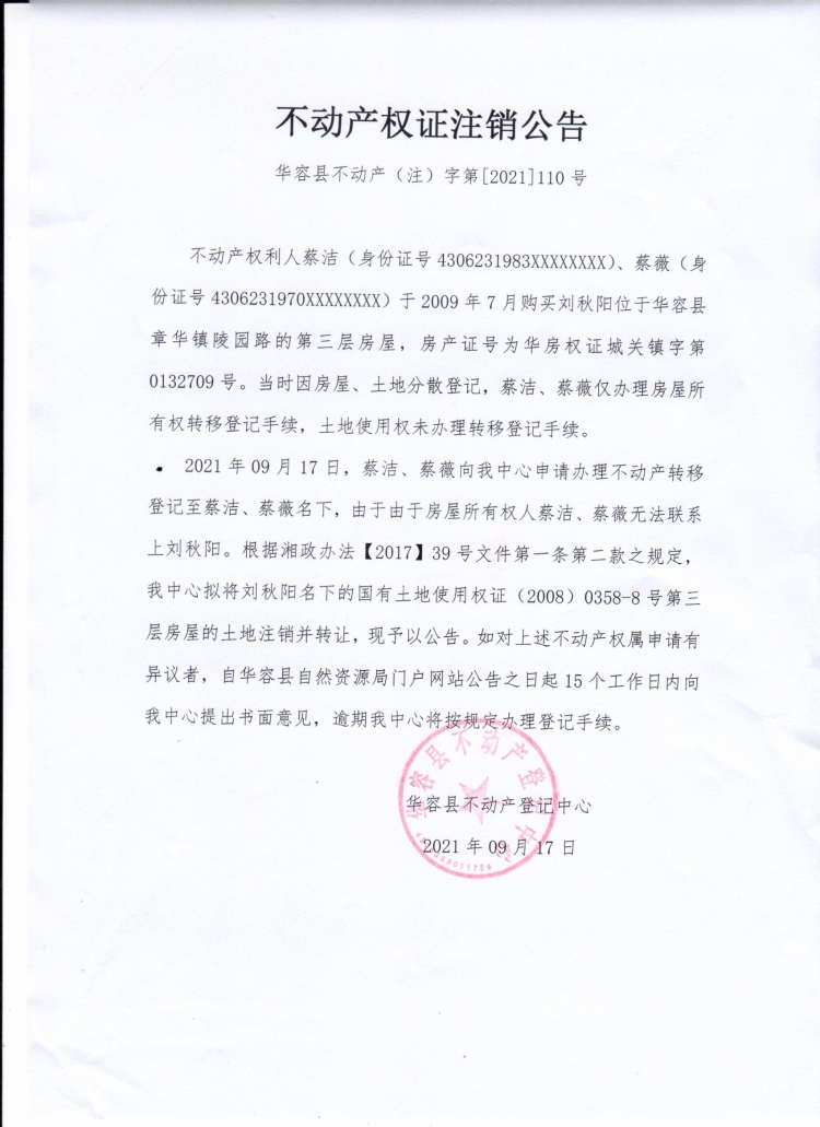 不动产权证书注销公告【(刘秋阳转蔡洁、蔡薇)】