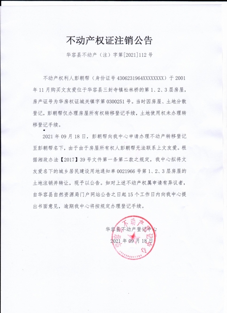 不动产权证书注销公告【(文友爱转彭朝帮)】