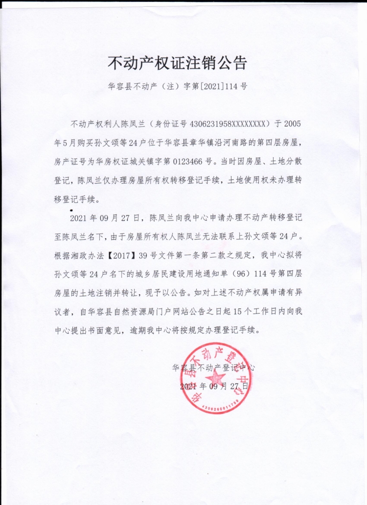 不动产权证书注销公告【(孙文颂等24户转陈凤兰)】