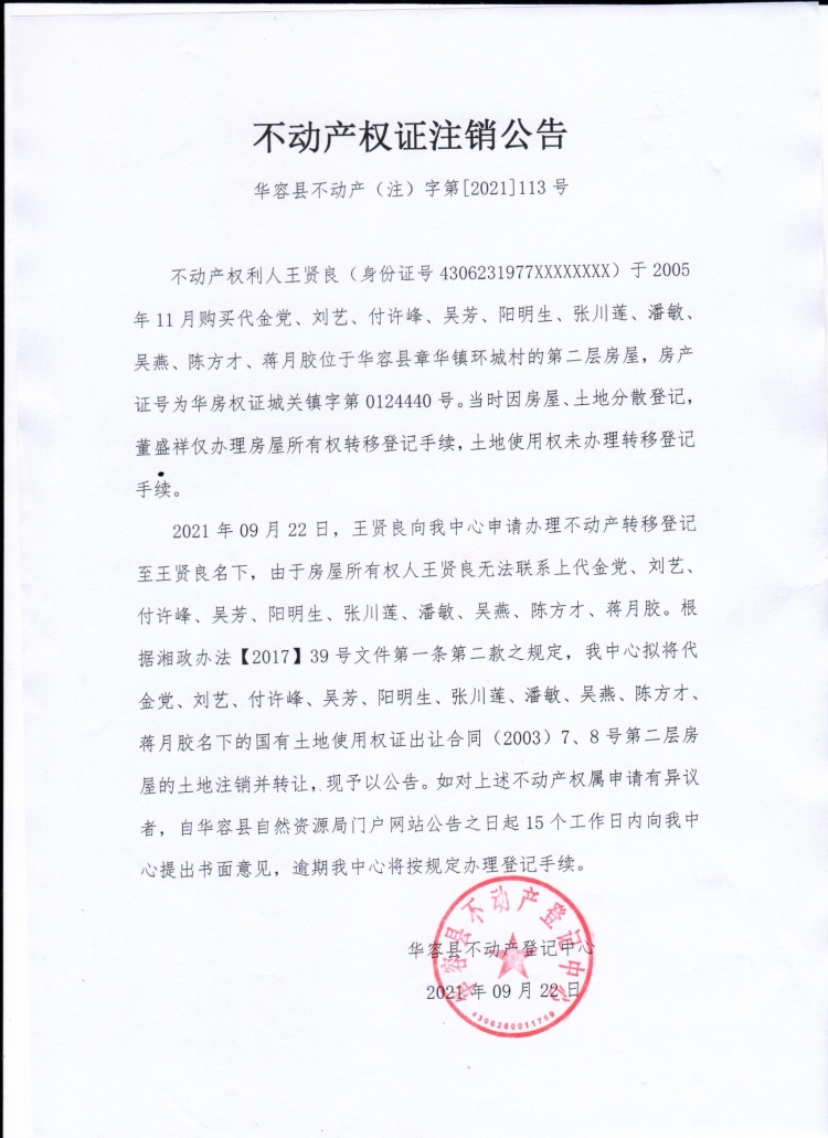 不动产权证书注销公告【(代金党、刘艺等十户转王贤良)】