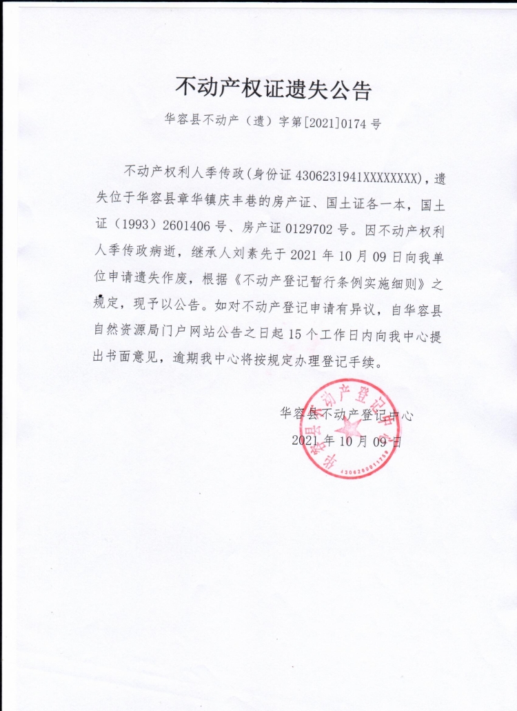 不动产权证遗失公告【国土证 房产证(季传政)】