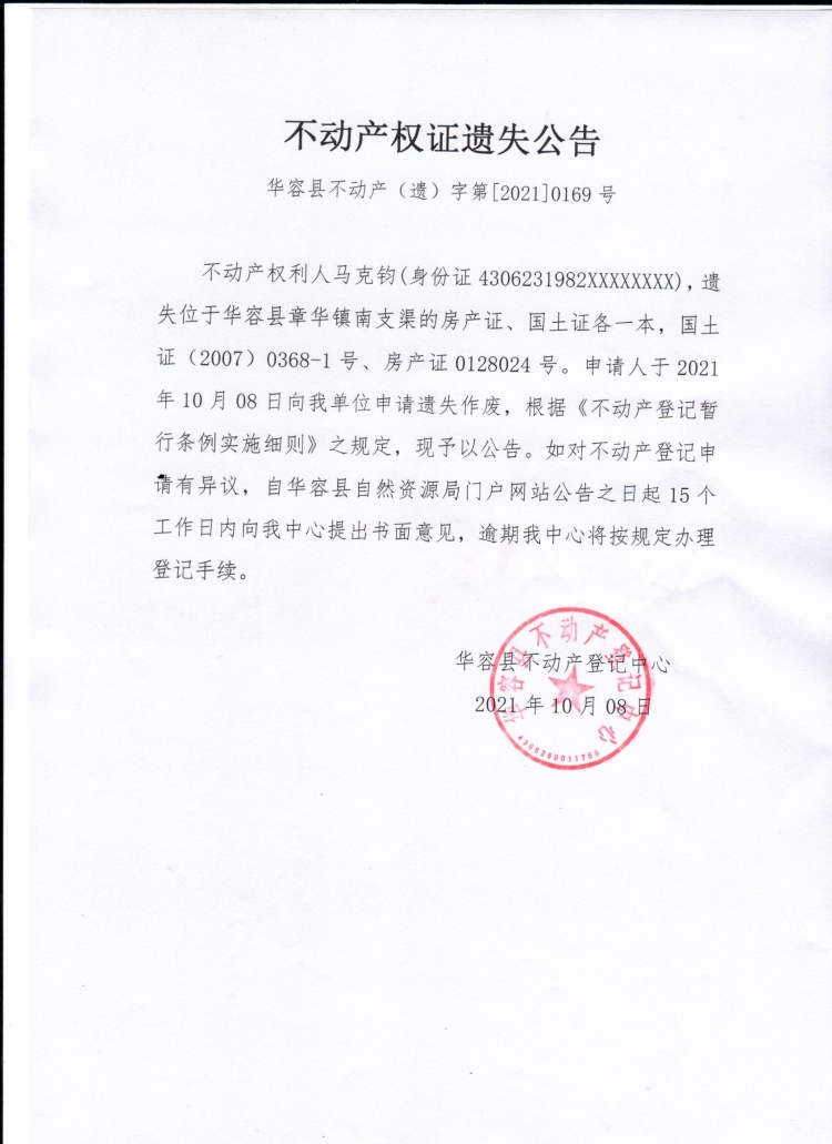 不动产权证遗失公告【国土证 房产证(马克钧)】