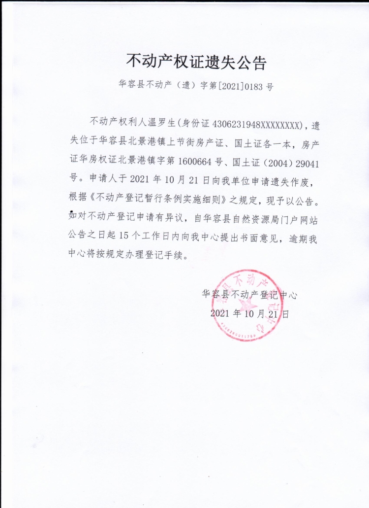 不动产权证遗失公告【国土证 房产证(温罗生)】