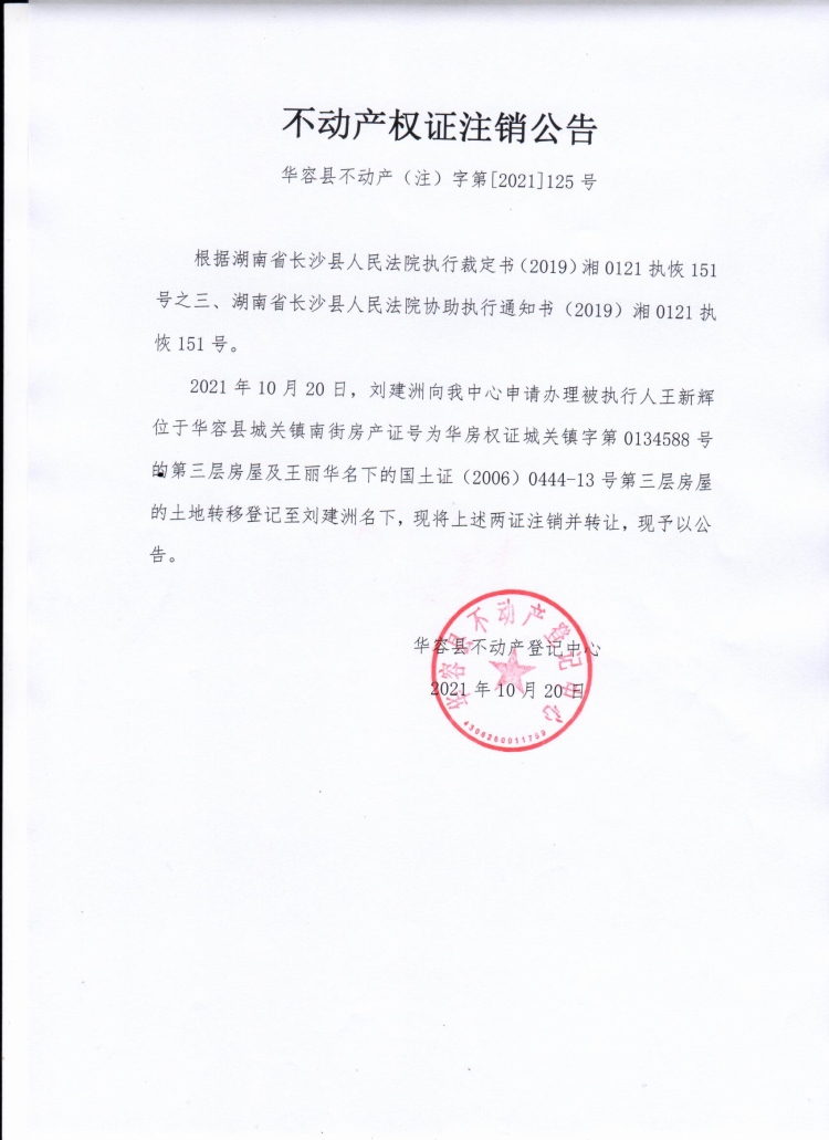 不动产权证书注销公告【(王新辉、王丽华转刘建洲)】