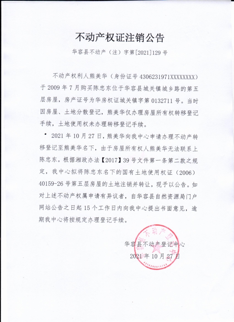 不动产权证书注销公告【(陈忠东转熊美华)】