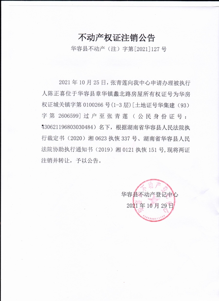 不动产权证书注销公告【(陈正喜转张青莲)】