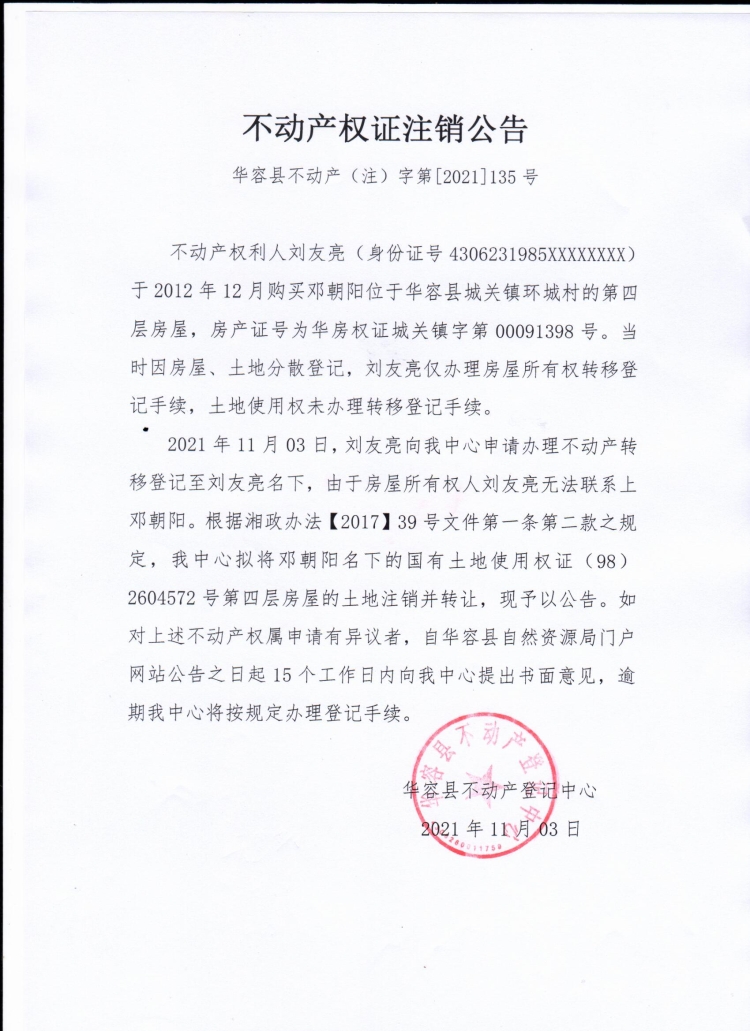 不动产权证书注销公告【(邓朝阳转刘友亮)】