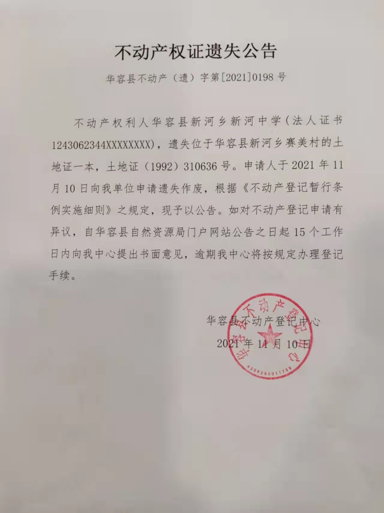 不动产权证遗失公告【国土证(华容县新河乡新河中学)】
