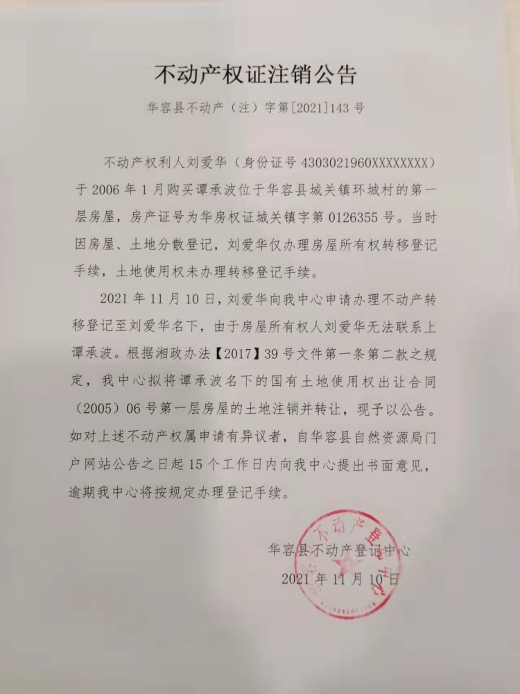 不动产权证书注销公告【(谭承波转刘爱华)】