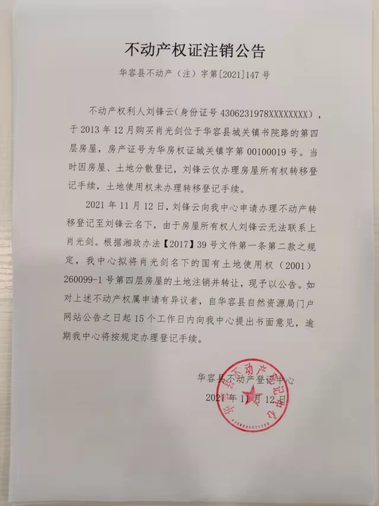 不动产权证书注销公告【(肖光剑转刘锋云)】